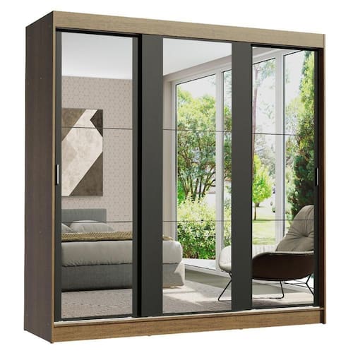São três portas de correr com trilhos em alumínio e deslizamento suave, que otimizam o espaço do quarto, sem atrapalhar no momento da abertura. Os espelhos dão um grande destaque ao móvel e ampliam o ambiente.
