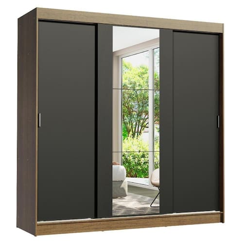 São três portas de correr com trilhos em alumínio e deslizamento suave, que otimizam o espaço do quarto, sem atrapalhar no momento da abertura. Além disso, a porta central conta com espelhos que ampliam o ambiente e são muito práticos no uso diário.