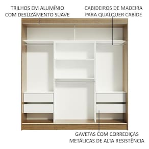 Possui também quatro gavetas espaçosas, dois cabideiros com espaço para roupas longas e um cabideiro para roupas mais curtas. Tem lugar pra tudo que um casal precisa: malas, calçados, travesseiros, colchas e muito mais!
