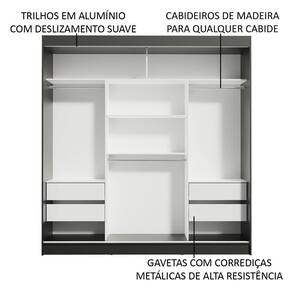 São três portas de correr com trilhos em alumínio e deslizamento suave, que otimizam o espaço do quarto, sem atrapalhar no momento da abertura. Possui também quatro gavetas espaçosas, dois cabideiros com espaço para roupas longas e um cabideiro para roupas mais curtas.