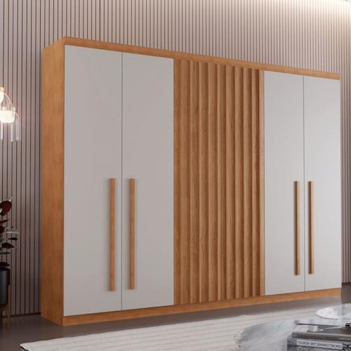 O Guarda Roupa Casal Ripado 6 Portas em MDF Denver Rufato combina funcionalidade e funcionalidade em um design clássico e atemporal. Com estrutura 100 em MDF e acabamento em pintura UV, oferece alta durabilidade e sofisticação. Possui 6 portas com detalhes ripados e puxadores em madeira, além de 4 gavetas com fundo reforçado e corrediças telescópicas. A divisão ele/ela facilita a organização, enquanto os 2 cabideiros e 1 calceiro em alumínio garantem resistência para roupas mais pesadas. Ideal para quem busca um móvel espaçoso, resistente e cheio de estilo para o quarto.