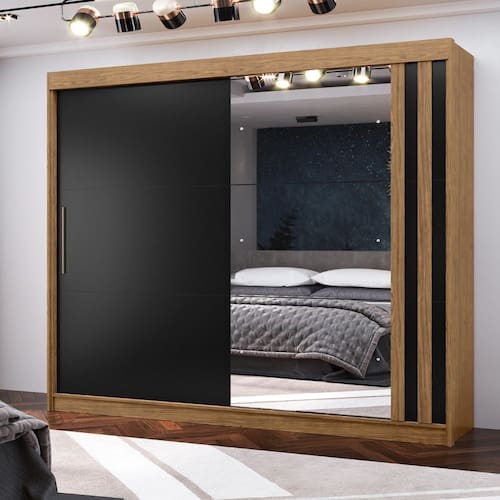 Caracter?sticas: Estrutura 100 MDF Acabamento pintura UV texturizada Com Espelho 2 Portas de Correr 4 Gavetas Internas Com detalhe Ripado Corredi?as telesc?picas Cabideiro em alum?nio Puxador em alum?nio Peso suportado por prateleira: 8kg Peso suportado por gavetas: 3kg