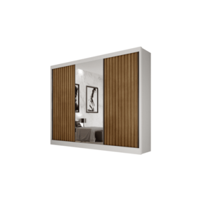 Particularidades do guarda-roupa: Características: - 100% MDF; - Colunado em 25mm; - Espelho com película de segurança;; - 6 Gavetas internas com puxadores; - Corrediças telescópicas; - Trilho inferior em alumínio e roldanas com amortecedores; - Roldana superior com guia zero e freio; - Fundo inteiriço; - Cabideiros em alumínio; - Duas opções de interno;