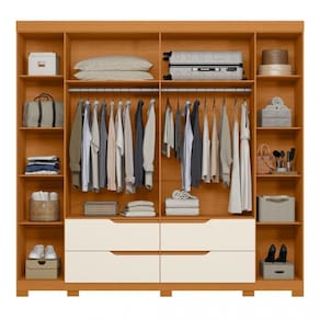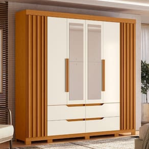 Características: 10 Prateleiras 4 Gavetas 6 Portas sendo as laterais com acabamento ripado Cabideiro em alumínio Corrediças telescópicas Dobradiça Slow Motion Estrutura em MDP Moldura em 15 mm 7 Espelhos nas portas centrais Possui pés Puxadores cava