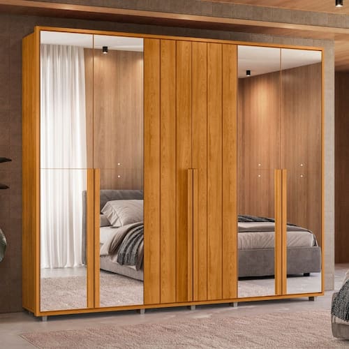 Com design sofisticado e funcional, o Guarda Roupa Casal Ripado em MDF com Espelhos 6 Portas e Pés Volpi Madetec é ideal para quem valoriza espaço e elegância. Fabricado 100 em MDF, possui 6 portas com ripado angular, cabideiros retráteis em alumínio com pistão a gás, 6 gavetas e 4 sapateiras deslizantes com corrediças telescópicas. A estrutura reforçada com moldura de 25mm, dobradiças com amortecimento e puxadores cava em MDF garantem modernidade e durabilidade. Com largura de 2,78m e pés em poliestireno, suporta até 114kg.