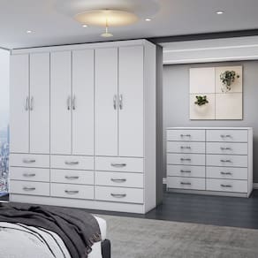 O(a) Guarda-Roupa Casal Ruby 6 Portas 9 Gavetas com Cômoda 10 Gavetas Branco - Loja é produzido em MDP na escala de brilho Fosco, e possui um grau de dificuldade de montagem: Médio.