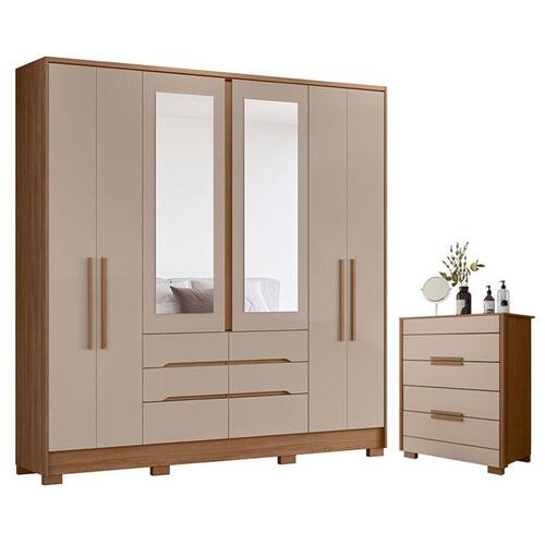 Começou a montar seu quarto? Então apresentamos para você este belo conjunto composto pelo guarda roupa da linha San Francisco e a cômoda da linha Dhara. O guarda roupa conta com seis portas, sendo as duas centrais com espelho. Com seis gavetas proporciona um espaço extra para acomodar suas roupas. Completando o conjunto, a cômoda conta com quatro gavetas. Assim como o guarda roupa, possui puxadores em MDF, corrediças telescópicas e pés em PVC, proporcionando mais estabilidade e facilitando na hora da limpeza. Fabricados pela Moval, são desenvolvidos em MDP aliando beleza, funcionalidade e resistência. Perfeito para compor seu quarto com muito estilo. Aproveite e garanta já o seu!