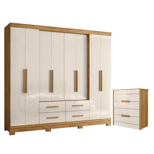 Organize seu quarto com elegância e o melhor custo benefício do mercado. Apresentamos o Guarda Roupa Casal San Lorenzo e Cômoda Dhara fabricados pela Moval. Guarda Roupa com 08 portas, portas laterais avançadas, 04 gavetas com corrediças telescópicas, puxadores na cor bronze, cabideiro e calceiros em alumínio para melhor organização interna e pés em PVC. A cômoda possui 04 gavetas com corrediças telescópicas, moldura lateral de 25mm, tampo de 15mm, puxadores em MDF, pés em PVC e um design moderno que combina com qualquer decoração. Fabricado com materiais de alta qualidade que garante resistência e durabilidade ao produto. Confira mais detalhes e aproveite!