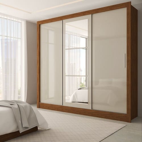 O(a) Guarda-Roupa Casal Sophia 3 Portas 3 Gavetas com Espelho Cinamomo/Off White - Loja é produzido em MDP na escala de brilho Brilho, e possui um grau de dificuldade de montagem: Médio.