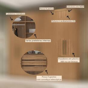 O Guarda Roupa Sumatra desenvolvido pela Demóbile irá te encantar! Sua estrutura em MDP super reforçado garante muito mais qualidade e durabilidade do móvel, conta com 6 portas, 3 gavetas, maleiro espaçoso e varias prateleiras internas com espaços bem distribuídos para uma boa acomodação de roupas e objetos. Seu design super moderno, valoriza e entrega muito charme e elegância ao ambiente, tornando perfeito para você. Confira e aproveite!