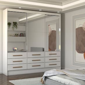 O(a) Guarda-Roupa Casal Taylor Premium 3 Portas 9 Gavetas com Espelho Branco - Loja é produzido em MDP na escala de brilho Fosco e Semi-Brilho, e possui um grau de dificuldade de montagem: Médio.