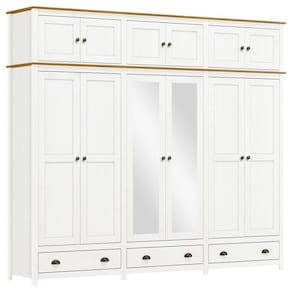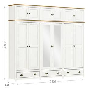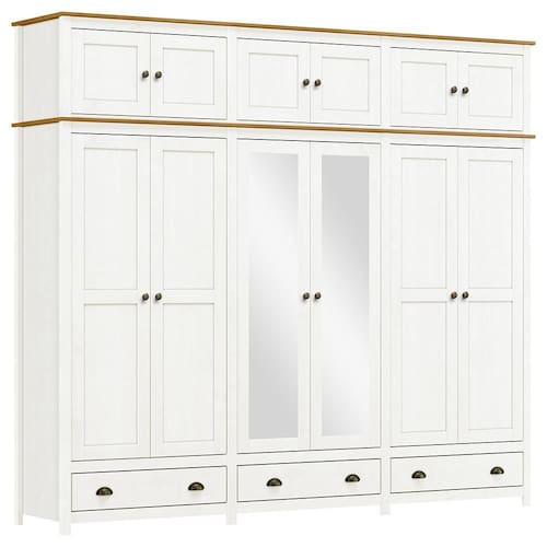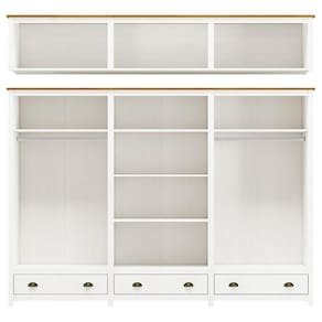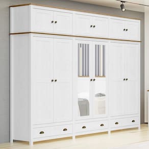 O Guarda-Roupa Casal Topázio 12 Portas e 3 Gavetas com Espelho da Finestra Móveis combina elegância, resistência e funcionalidade em um só móvel. Fabricado com estrutura em madeira maciça de pinus de reflorestamento, recebe acabamento refinado com pintura acetinada em verniz PU e UV, garantindo durabilidade e beleza por muito mais tempo. Com 12 portas, sendo as centrais com espelho, oferece amplo espaço para organização. As dobradiças com amortecimento proporcionam mais conforto e segurança no uso diário. Conta ainda com prateleiras em madeira maciça que suportam até 10kg distribuídos, 3 gavetas com corrediças telescópicas para um deslizamento suave e cabideiros em alumínio com capacidade de até 8kg. Os puxadores metálicos em ouro envelhecido e os pés alongados em madeira maciça conferem um visual sofisticado e atemporal. Ideal para quem busca um guarda-roupa espaçoso, funcional e com design de alto padrão para o quarto do casal.