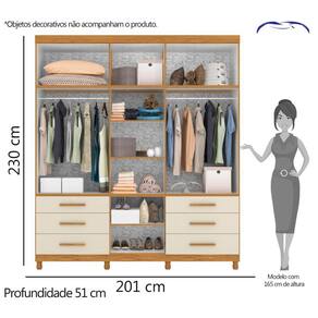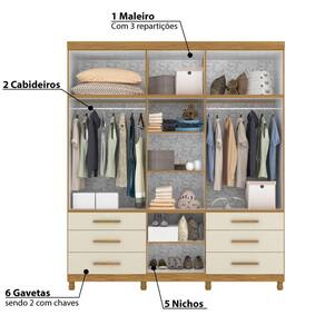 Características - Carvalho Grife e Off White - Estrutura: MDP 15 mm - Acabamento: Pintura UV fosco - 3 Módulos - 11 Portas - 6 Gavetas, sendo 2 com chaves - Corrediças telescópicas - 3 Prateleiras - 1 Maleiro com 3 repartições - 2 Cabideiros de alumínio - Puxadores em MDF revestidos - Pés com regulagem de altura - Peso suportado: 100 kg - Produto entregue desmontado - Marca Albatroz