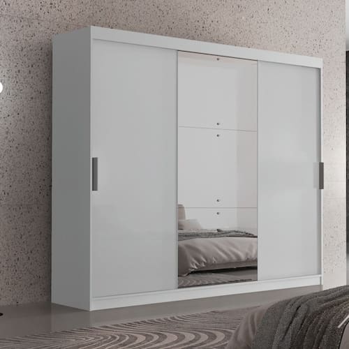 Características: Guarda Roupa Marca: Moderna Modelo: Vitor Tamanho: Casal Material: MDF Quantidade de Portas: 03 Possui Espelho: Sim Tipo de Abertura: De Correr Quantidade de Cabideiros: 06