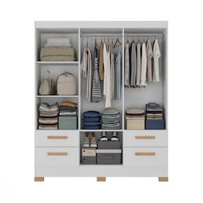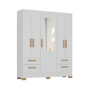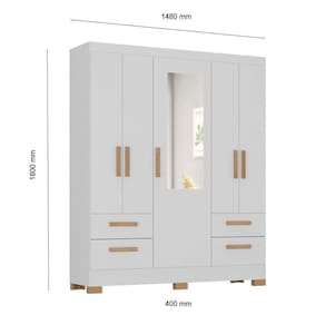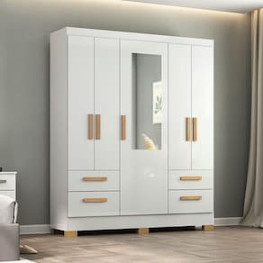 Caracteristicas: - Estrutura em MDP - 4 gavetas - Suporta ate 5kg cada - Medida interna util das gavetas: Altura: 9 cm | Largura: 33 cm | Profundidade: 42 cm - Nao possui gavetas internas - Corredicas metalicas de 300mm - Dobradicas metalicas de 25mm - Possui 2 prateleiras - Suporta ate 5kg - 1 cabideiro em madeira revestido - 6 pes em PVC marrom claro de 05cm - 5 Puxadores em MDF madeirado - 5 portas de bater (1 porta possui espelho) - Garantia 3 meses