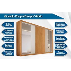 Todas as informações divulgadas são de responsabilidade exclusiva do fabricante/fornecedor. Tipo de Estrutura do Móvel: 100% MDF | Quantidade de Portas: 3 Portas de Correr | Quantidade de Gavetas: 6 Gavetas | Quantidade de Prateleiras: 7 Prateleiras | Tipo de Pintura: UV | Quantidade de nichos: 8 nichos | Características de móveis: Ângulo Reto | Diferenciais da Gaveta: c/ Corrediças Telescópicas | Diferenciais dos Nichos: Nicho Decorativo | Tipo de Acabamento da Pintura: Fosca | Vantagens Extras dos Guarda Roupas: Desmontável | Tipo de puxador: Madeira | Certificação de Qualidade: Qualidade Aprovada | Garantia 3 Meses: 3 | ID Loja Oficial MELI: 1557 | Garantia de Fábrica: Garantia de Fábrica | Tamanho do Guarda-Roupa: Casal | Com gavetas: Sim | Com portas: Sim | Possui Nichos: Sim | Com prateleiras: Sim | É kit: Não | Requer montagem: Sim | Inclui manual de instruções: Sim | Inclui kit de instalação: Sim | É Lavável: Não | É à prova d água: Não | Tipo de Cabideiro: Aéreo | Origem: Nacional | Possui Corrediças Telescópicas: Sim | Possui Puxador: Sim | Inclui espelho: Sim | Com pés: Não | Tipo de Abertura das Portas: Correr | Com baú: Não | Quantidade de Cabideiros: 4 | Material dos Cabideiros: Alumínio | Com cabideiros: Sim | Possui Espaço para Calçados: Sim | Possui Fita de Borda: Sim | Quantidade de Espelhos: 1 | Quantidade de Portas com Chave: 0 | Quantidade de Gavetas com Chave: 2 | Garantia: 3 meses | Diferenciais das Portas: Portas Ripadas | Tipo de produto: Guarda-roupa | Ambiente Indicado: Áreas Internas e Externas | Material: Madeira | Capacidade: 1 kg | Com espaço para calçado: Sim | Idade: Adultos | Setores de pendurado: Superior | Tempo de montagem: 1 h | Tipo de produto (guarda roupa): Guarda-roupa | Acessórios de montagem incluidos: Manual de instruções | Fonte do produto: N/A | Materiais da fita de borda: ABS | Condição do item: Novo | Produto: N/A | Tipo de Guarda Roupa: Casal | Cômodo Indicado: Multiuso | Tamanho: Único | Código universal de produto (GTIN): 7899585139181 | Condição do Item: Novo | Link Site: https://www.costaricacolchoes.com.br/produtos.asp?produto=42552 | Numeral: 0 | Não se Aplica: N/A | Não Possui: Não | Linha/Modelo: Europa | Cor Cnova: Blush | Cor Meli: Branco | Categoria Trilha: Quarto de Casal> Guarda Roupa Casal | Categoria - Sub: Guarda Roupa Casal | Categoria - Pai: Quarto de Casal | Comprimento Embalagem: 274.00 | Largura Embalagem: 97.00 | Altura Embalagem: 63.00 | Peso: 264.00 Kg | Kit: 0 | Peso Real Kg: 264.00 | Peso Cubado: 162.50 | Volumes: 9 | M3: 0.65 | Comprimento/Profundidade: 64 cm | Largura: 275 cm | Altura: 235 cm | Tamanho Montado: Larg:275.00 x Comp/Prof:64.00 x Alt: 235.00 | Comprimento/Profundidade Montado: 64.00 | Largura Montado: 275.00 | Altura Montado: 235.00 | Cor Fabricante: Cor Peroba/Off White/Peroba | Data Cadastro: 2023-11-10 16:37:57 | Sigla Estoque: 2 | Marca: Europa