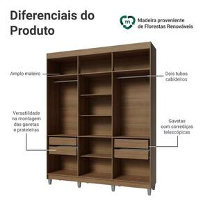 Este modelo de 180 cm de largura conta com dois cabideiros, várias prateleiras amplas e quatro gavetas espaçosas, garantindo flexibilidade e espaço suficiente para acomodar roupas, calçados e acessórios com facilidade. As gavetas contam com corrediças que permitem abertura total, enquanto o amplo maleiro é perfeito para itens maiores. Além disso, você pode ajustar as gavetas e prateleiras para personalizar o interior conforme suas necessidades.