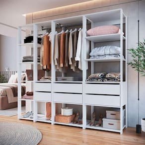 que tal guarda-roupa closet easy? se você gosta de closets modernos, o guarda-roupa easy é a pedida certa! com estrutura em mdp e cabideiro em aço, ele tem a resistência necessária para acomodar seus pertences, sejam dobrados ou estendidos. já para dar aquele toque especial à decoração, o móvel é sem portas mas tem 6 gavetas, assim une o conceito aberto com a organização de itens que não precisam ficar expostos. daí é só arrumar tudo e aproveitar uma rotina prática e um ambiente bonito ;)