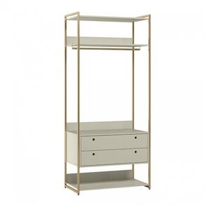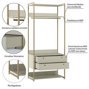 O Closet Industrial Olivar-Módulo 02 é um produto que mostra uma diversidade de materiais, com metal nas laterais e MDF e MDP de 15 mm. Ele possui 4 prateleiras para acomodar objetos ou roupas, um cabideiro de metal, duas gavetas amplas com corrediças metálicas, um detalhe usinado na frente da gaveta para servir como puxador e pés reguláveis.
