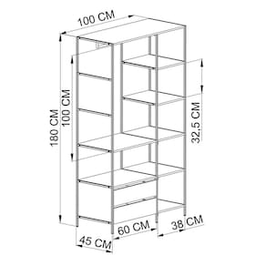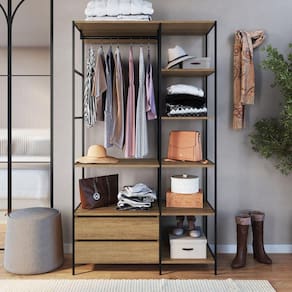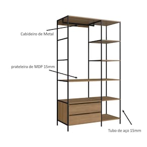O closet P1025 da Placa & Ponto , possui estrutura metálica, 2 gavetas, 5 nichos e uma prateleira em MDP e cabideiro em metal. Com este lindo produto em estilo industrial, a organização, beleza e bom gosto são garantidos em seu lar! Acabamento da Gaveta: Finish Foil Acabamento da Prateleira: Finish Foil Acabamento dos Pés: Pintura Altura dos Pés: 9 Ambiente Principal: Quarto Complexidade da Montagem: Média: pode ser montado por mais de uma pessoa e/ou necessite de maior conhecimento para montagem Composição: 30% metal e 70% MDP Cor: Preto/Mel Cor do Produto: Preto/Mel Cor Flex: Não Cor Interna: Marrom Escala de Brilho: Fosco Espessura do Material da Estrutura: 15 Gaveta com Chave: Não Itens Inclusos: 1 Closet, 1 Kit Ferragens, 1 Manual de Montagem Linha ou Coleção: P1025 Manual de Montagem e Instalação: https://product-hub-prd.madeiramadeira.com.br/866038/documents/02d5564d-6c15-415b-8b0e-c20fed1a4384178982701019225p1025manual.pdf Material da Gaveta: MDP Material da Prateleira: MDP Material dos Pés: Metal Material Principal: MDP Módulo Individual: Sim Montagem Flex: Não Necessita Montagem: Sim Origem do Produto: Nacional Pés Reguláveis: Não Peso: 44 Peso Máximo por Gaveta: 5 Peso Máximo por Prateleira: 5 Possui Cabideiros: 01 Possui Calceiros: Não Possui Espelho: Não Possui Possui Pés: 04 Possui Portas: Não Possui Prateleiras: 06 Possui Rodízio: Não Recomendações de Uso, Manutenção e Limpeza: Para a limpeza do móvel utilizar uma flanela seca. Sapatas Niveladoras: Não Sistema de Montagem: Parafusos e Cavilhas Suporta Até (kg): 40 Tipo de Corrediça da Gaveta: Metálica Simples Tipo de Puxador da Gaveta: Embutido Ean: 7909903392430