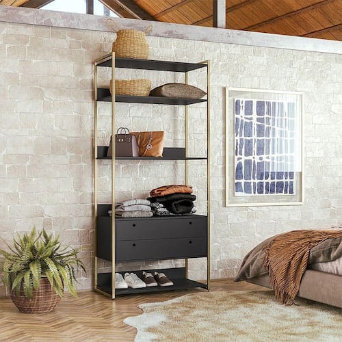 O Closet Estante Ind. Olivar-Módulo 01 é um produto que mostra uma diversidade de materiais, com metal nas laterais e MDF e MDP de 15 mm. Ele possui 5 prateleiras para acomodar objetos ou roupas, duas gavetas amplas com corrediças metálicas, um detalhe usinado na frente da gaveta para servir como puxador e pés reguláveis.Tipo: Closet estante ind.Modelo: Módulo 01Cor: PretoDimensões (AxLxP): 200cm x 89cm x 46,8cmCaracterísticas:Material da estrutura: MDF E MDP 15MMAcabamento: Pintura UVEscala de Brilho: AcetinadoPeso máx suportado: 30kgGarantia: 3 mesesRecomendações de limpeza: Pano úmido. Não aplicar lustra móveis.Necessita montagem: SimQuantidade de pés: 4Tipo de pés: RegulávelQuantidade de gavetas: 2Tipo de corrediça: MetálicaPeso suportado pelas gavetas: 2kgPuxadores: Usinados no MDFQuantidade de prateleiras: 5Tipo de prateleiras: FixasATENÇÃOAS IMAGENS SÃO MERAMENTE ILUSTRATIVAS E PODEM SOFRER VARIAÇÕES DE COR E PEQUENOS DETALHES DE ACORDO COM O SEU MONITOR, ILUMINAÇÃO DO AMBIENTE E ATÉ MESMO A SUA PERCEPÇÃO VISUAL.Guarda Roupa Closet Industrial Solteiro 2 Gavetas - Preto