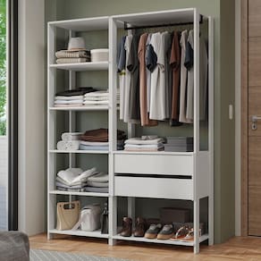 - Um Closet aberto de 70 cm de largura com duas gavetas, um cabideiro e uma prateleira