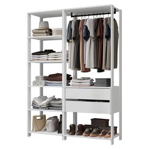 - Um Closet aberto de 70 cm de largura com duas gavetas, um cabideiro e uma prateleira