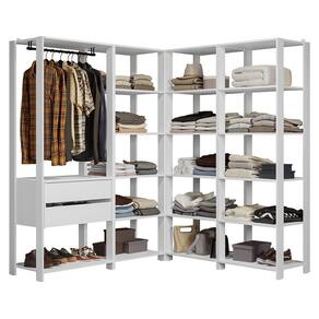 Cada módulo foi projetado para proporcionar um espaço de armazenamento organizado, unindo praticidade e estilo para seu ambiente. Você vai receber três closets abertos de 59 cm de largura, cada um com cinco prateleiras amplas, perfeitos para roupas dobradas e calçados. E um closet aberto de 70 cm de largura, com duas gavetas espaçosas, ideais para itens menores e acessórios, além dos cabideiros.