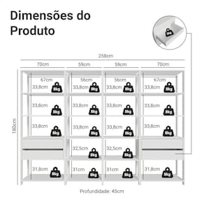 Cada módulo foi projetado para proporcionar um espaço de armazenamento organizado, unindo praticidade e estilo para seu ambiente. Você vai receber dois closets abertos de 59 cm de largura, cada um com cinco prateleiras amplas, perfeitos para roupas dobradas e calçados. E dois closets abertos de 70 cm de largura, cada um com duas gavetas espaçosas, ideais para itens menores e acessórios, além de quatro prateleiras.