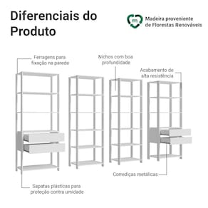 Além disso, o móvel conta com acabamento branco de alta resistência, pés com sapatas plásticas que protegem contra a umidade e ferragens incluídas para a fição na parede, garantindo mais estabilidade e segurança.