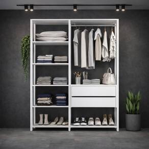 Amplo espaço interno e elegância: O closet é equipado com 7 prateleiras espaçosas (suportam até 8kg em cada), ideais para acomodar suas roupas e calçados favoritos com estilo e organização inigualáveis. O cabideiro de madeira revestido garante que suas roupas, sejam longas ou curtas, fiquem sempre impecáveis. Além disso, com 2 gavetas que possuem corrediças metálicas, o manuseio dos seus pertences ganha leveza e praticidade. Valorize cada peça do seu vestuário com um design aberto e moderno que realça qualquer espaço.