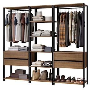 Com uma estrutura aberta, oferece fácil acesso aos seus pertences no dia a dia. Nesta versão, é composto por três peças independentes, proporcionando com um cabideiros metálicos, diversas prateleiras e quatro gavetas espaçosas, proporcionando um amplo espaço de armazenamento.