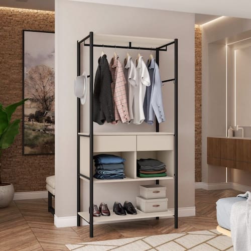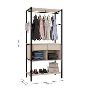 Características: Material aço carbono Acabamento fosfatização Pintura eletrostática a pó Madeiramento em MDP com revestimento em BP 2 Gavetas 2 Nichos Cabideiro