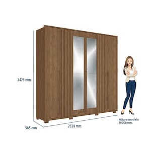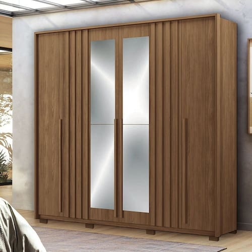 ambiente. Acabamento da Prateleira: Verniz Escala de Brilho da Prateleira: Fosco Possui Cabideiros: Sim Acabamento da Gaveta: Pintura Texturizada UV Escala de Brilho da Gaveta: Fosco Possui Organizador de Gaveta: Não Acabamento da Porta: Pintura Texturizada UV Escala de Brilho da Porta: Fosco Material do Puxador da Porta: MDF Acabamento dos Pés: Poliéster Altura do Espelho: 100 cm Altura dos Pés: 5 cm Altura Máxima dos Pés: 5.0000 Ambiente Principal: Quarto codigo_ean: 7900288072597 Complexidade da Montagem: Média: pode ser montado por mais de uma pessoa e/ou necessite de maior conhecimento para montagem Cor: Jatoba Cor do Produto: Jatoba Cor do Puxador: Marrom Cor Interna: Jatobá Escala de Brilho: Fosco Espessura da Estrutura (mm): 15 mm Espessura das Portas (mm): 15 mm Espessura das Prateleiras (mm): 15 mm Espessura do Espelho: 3 mm Espessura do Fundo (mm): 2,5 mm Espessura do Fundo das Gavetas (mm): 2,5 mm Fita Integrada: Sim Formato do Espelho: Retangular Gaveta com Chave: Não Guarda-Roupa Suporta Até (kg): 115 kg Itens Inclusos: 1 Guarda Roupa, 2 Kit Ferragens e Manual de Montagem Largura do Espelho: 35 cm Linha ou Coleção: Contemporânea Manual de Montagem e Instalação: https://product-hub-prd.madeiramadeira.com.br/979070/documents/28885841-97c8-4ff7-a627-0bb7375eb59b48371740081666979070149529.pdf Marca: Santos Andirá Material da Gaveta: MDP Material da Porta: MDP Material da Prateleira: MDP Material dos Pés: PVC Material Principal: MDP modular: Não Montagem Flex: Sim - Há 2 Posições Diferentes Possíveis para as Portas com Detalhe Usinado Ripado. Necessita Montagem: Sim Origem do Produto: Nacional Peso: 224,7 kg Peso Máximo por Gaveta: 3 kg Peso Máximo por Prateleira: 8 kg Porta Janelada: Não Possui Espelho: Sim Possui Pés: 08 Possui Portas: Sim Possui Prateleiras: Sim Produto Montado: Sim Quantidade de Cabideiros: 03 Cabideiros Quantidade de Espelho: 04 Espelhos com Tamanhos Iguais Quantidade de Gavetas: 04 Gavetas Quantidade de Portas com Espelhos: 2 Portas com Espelho Quantidade de Prateleiras: 07 Prateleiras Recomendações de Uso, Manutenção e Limpeza: Durabilidade: Permite ser desmontado e montado até cinco vezes. 5 – Manutenção: Não limpar com álcool ou qualquer outro produto químico, utilize somente pano seco ou levemente umedecido. Sapatas Niveladoras: Não Sistema de Montagem: Parafusos, Cavilha, Minifix Tipo de Corrediça da Gaveta: Metálica Telescópica Tipo de Dobradiça/Corrediça da Porta: Metálica Tipo de Fixação do Espelho: Fita Dupla Face Tipo de Gaveta: Interna Tipo de Guarda-Roupa: Solteiro Tipo de Puxador da Gaveta: Não Possui Tipo de Puxador da Porta: Externo