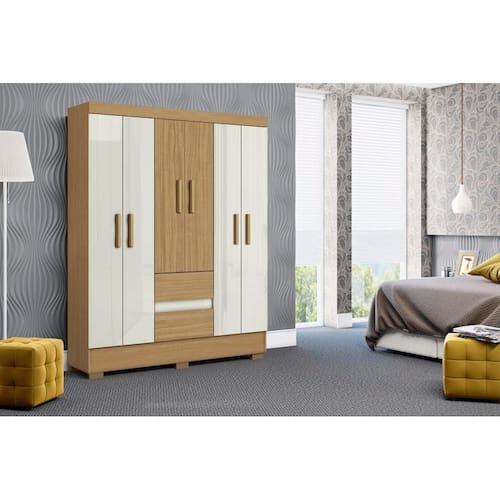 O Guarda-Roupa Coimbra 6 Portas possui excelentes divisões internas, oferecendo amplo espaço para armazenamento de roupas e pertences. Possui um cabideiro de madeira revestido em PVC para sustentar roupas de forma durável. Suas duas gavetas contêm corrediças metálicas para um deslize suave, além de facilitar a organização. O acabamento em verniz texturizado fosco conserva o móvel, proporcionando beleza, resistência e durabilidade.