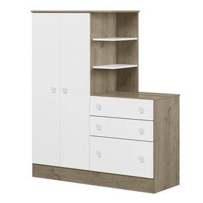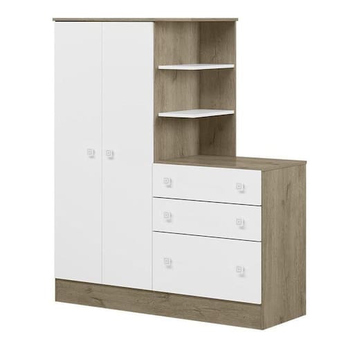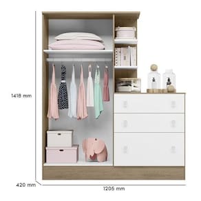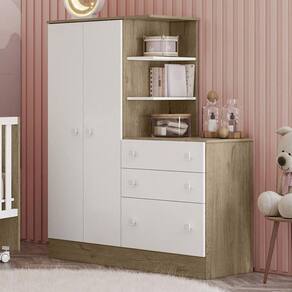 Guarda Roupa Com Cômoda Infantil Doce Sonho 2 Portas E 3 Gavetas Carvalho/branco - Qmovi Carvalho/branco Guarda Roupa com Cômoda Infantil Doce Sonho 2 Portas e 3 Gavetas - Qmovi Pensado para quem precisa de otimização no espaço, o Guarda Roupa com Cômoda da linha Doce Sonho, é perfeito para acomodar os objetos do bebê com praticidade e comodidade. Organize tudo o que você precisa em um só lugar com este móvel moderno e funcional. ESPECIFICAÇÕES: - Estrutura em MDP - Pintura UV - 2 Portas - Dobradiças metálicas - 3 Gavetas - Corrediças metálicas - Cabideiro oblongo metálico - Puxadores em plástico poliestireno - Cômoda e nichos acoplados no guarda-roupa - Maior organização e praticidade