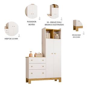 Características: Marca: Qmovi Modelo: Q Encanto Material: MDP 15/12 Material dos Pés: MDF em 25mm Acabamento: Pintura UV Escala de Brilho: Acetinado Tipo de Puxador: Puxador Plástico Gavetas com corrediças metálicas de 350mm Quantidade Prateleiras: 04 Quantidade de Gavetas: 03 Quantidade de Portas: 02 Quantidade de Cabideiros: 01 Peso suportado: 60Kg (Distribuído e sem impacto) Peso suportado prateleiras: 3/7/10Kg (Distribuídos e sem impacto) Peso suportado gavetas: 5Kg (Distribuídos e sem impacto) Peso suportado tampo: 7Kg (Distribuídos e sem impacto) Peso suportado cabideiro: 15Kg (Distribuídos e sem impacto)