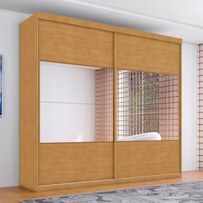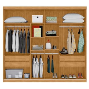 Feito em MDF 4 gavetas com corrediças telescópicas, 2 Portas deslizantes, 6 prateleiras e 4 cabideiro.