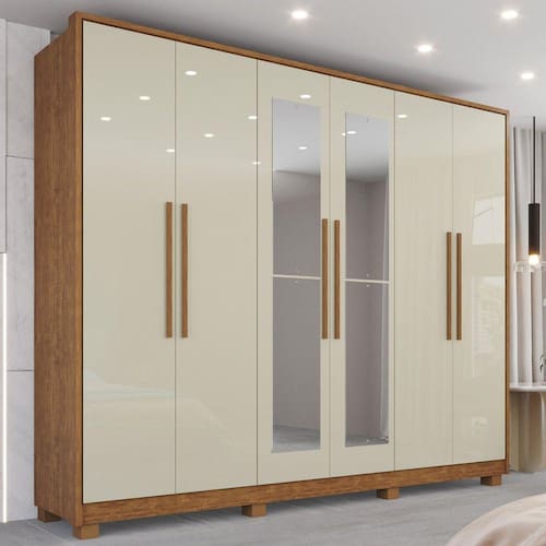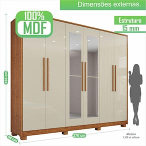 O Guarda-Roupa Potenza IMOP é um móvel conceitual e imponente, ele impressiona por sua grandiosidade, pelos espaços bem distribuídos e os detalhes pensados para atender as mais variadas necessidades do usuário, são eles: puxadores em mdf alongados com design moderno e funcional, portas com dobradiças 35 mm, cabideiros e calceiro metálicos, nichos central para acessórios, sapateiras, gavetas com corrediças telescópicas, para acomodar os seus pertences e proporcionar a melhor organização do espaço. Acabamento da Prateleira: Pintura UV Escala de Brilho da Prateleira: Semi-Fosco Possui Cabideiros: 03 Acabamento da Gaveta: Pintura UV Escala de Brilho da Gaveta: Semi-Brilho Possui Organizador de Gaveta: Não Acabamento da Porta: Pintura UV Escala de Brilho da Porta: Semi-Brilho Material do Puxador da Porta: MDF Altura do Espelho: 78 cm Altura dos Pés: 7 cm Ambiente Principal: Quarto Complexidade da Montagem: Média: pode ser montado por mais de uma pessoa e/ou necessite de maior conhecimento para montagem Cor: Cinamomo/Off-White Cor do Produto: Cinamomo/Off-White Escala de Brilho: Semi-Brilho Espessura do Espelho: 3 mm Formato do Espelho: Retangular Gaveta com Chave: Não Itens Inclusos: 1 Guarda-Roupa + Manual de Montagem + Kit Ferragens Largura do Espelho: 28 cm Linha ou Coleção: Potenza Manual de Montagem e Instalação: https://cdn2.madeiramadeira.com.br/atributo/imop/1780313-manual-roup-potenza-rev-0-0-24.pdf Material da Gaveta: MDF Material da Porta: MDF Material da Prateleira: MDF Material dos Pés: Polipropileno Material Principal: MDF modular: Não Necessita Montagem: Sim Origem do Produto: Nacional Peso: 231,95 kg Peso Máximo por Gaveta: 5 kg Peso Máximo por Prateleira: 3 kg Possui Calceiros: 01 Possui Espelho: Sim Possui Pés: 08 Possui Portas: Sim Possui Prateleiras: Sim Quantidade de Espelho: 04 Espelhos com Tamanhos Iguais Quantidade de Gavetas: 06 Gavetas Quantidade de Prateleiras: 10 Prateleiras Recomendações de Uso, Manutenção e Limpeza: Limpeza com pano macio e levemente umedecido. Não utilizar solventes a base e de inflamáveis. Não utilizar produtos abrasivos. Sapatas Niveladoras: Não Sistema de Montagem: Parafusos, cavilhas, dobradiças e puxadores. Tipo de Corrediça da Gaveta: Metálica Telescópica Tipo de Dobradiça/Corrediça da Porta: Aço Tipo de Fixação do Espelho: Parafusos Tipo de Gaveta: Interna Tipo de Guarda-Roupa: Casal Tipo de Puxador da Gaveta: Não Possui Tipo de Puxador da Porta: Externo