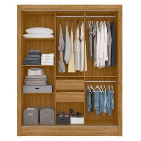 Feito em MDP, com duas gavetas com corrediças telescópicas, possui dois nichos e cinco prateleiras amplas e espaçosas podem ser utilizadas para guardar edredons, cobertores, caixas e sapatos
