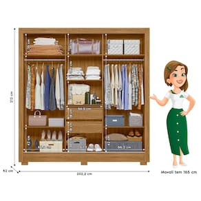 O Guarda-Roupa Bahamas é a escolha ideal para quem busca uma organização perfeita, pois possui divisórias ele/ela. Com 3 portas deslizantes, equipadas com trilhos de alumínio, oferece um design funcional e moderno. As portas laterais têm molduras de 25mm, enquanto a porta central conta com um espelho e sistema antiempeno metálico, garantindo durabilidade. Conta também com 2 gavetas com corrediças metálicas para um deslizamento suave e cabideiros em alumínio. Os puxadores em MDF proporcionam um toque elegante. É fabricado em MDP e com acabamento em impressão UV, garantindo qualidade e durabilidade. CARACTERÍSTICAS TÉCNICAS: - Produzido em MDP; - Possui Espelho; - Cabideiros em Alumínio; - 3 Portas de Correr com Trilho de Alumínio; - 2 Gavetas com Corrediças Metálicas; - Puxadores em MDF; - Pés em PVC. INFORMAÇÕES TÉCNICAS: Altura: 212 cm Largura: 202,2 cm Profundidade: 52 cm Peso: 122 kg INFORMAÇÕES ADICIONAIS: - Não realizamos a montagem do móvel e não nos responsabilizamos por ela. Verifique o produto antes de montá-lo. Produtos danificados na montagem não serão trocados. Montagem e instalação são por conta do comprador. - As imagens decorativas são ilustrativas e podem conter itens não inclusos. As cores do produto podem variar conforme o monitor, iluminação ou percepção visual. - Limpeza: Use um pano macio seco ou levemente umedecido com água. Não utilize materiais abrasivos como palha de aço ou objetos cortantes. - Garantia de 3 meses contra defeitos de fabricação conforme o Código de Defesa do Consumidor.