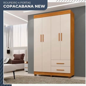 O Guarda Roupa Copacabana quatro portas e o movel ideal para organizar seu quarto e deixa-lo ainda mais pratico! Com design classico, ele possui elementos que dao a ele um toque de modernidade. O design clean deixa o ambiente mais aconchegante. A parte interna ampla possui varias prateleiras, possibilitando o armazenamento de cobertores, travesseiros e outros acessorios. Conta com cabideiro em aluminio, o que garante um suporte para maior peso. As gavetas sao externas oferecendo mais espaco e comodidade para organizar as coisas. E a solucao para pequenos espacos e perfeito para deixar o quarto mais pratico e bonito!