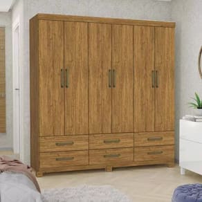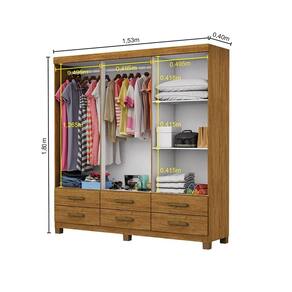 Guarda-Roupa Dallas é um produto perfeito para quem possui um ambiente com espaço reduzido e ainda procura qualidade e durabilidade no mesmo móveis. Possui 1,80m de altura, 1,53m de largura e 0,40m de profundidade combinado com 6 portas, 6 gavetas, 3 prateleiras e um grande cabideiro, deixando o produto com uma ótima divisão interna. O maleiro é ideal para guardar malas, cobertores, edredons. O cabideiro além de resistente, é ideal para pendurar pares de blusas, camisas acessórios. As prateleiras são perfeitas para colocar roupas como blusas, shorts, regatas, kits de maquiagem, toalhas, caixinhas com acessórios e bolsas menores. As gavetas fixadas sobre corrediças metálicas, são ideais para guardas blusas dobradas, shorts, malhas e roupas íntimas. Estrutura do produto em mdp.