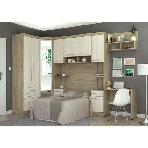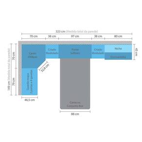 Um quarto completo com o melhor aproveitamento de espaço. O Canto contém 3 amplas prateleiras e uma porta em espelho com moldura em alumínio. Um Guarda Roupas com 2 portas com prateleira, cabideiro e 4 gavetas. Na cabeceira pode-se utilizar cama box de 78cm e 88cm de largura. O ambiente fica completo com a escrivaninha, painel e nicho para estudos, trabalhos e espaços para organizar livros, pertences e objetos do uso diário. Para esta proposta usamos as medidas de parede: Lado Cabeceira 323cm X 149cm.