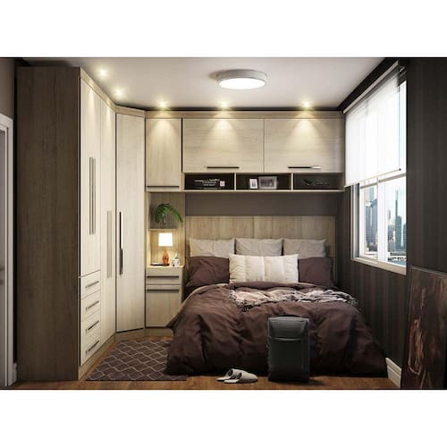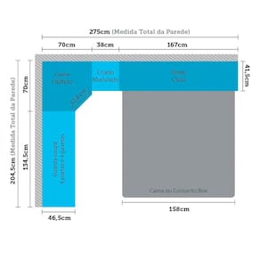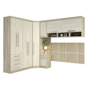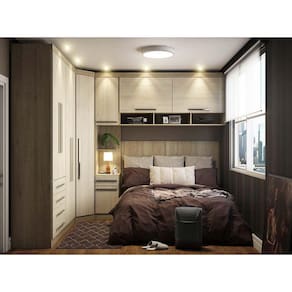 Precisando otimizar o espaço disponível em seu quarto? O Modulado Master é uma excelente opção. O Guarda Roupa de Canto aproveita aquele espaço que parece sem utilidade, com profundidade de 70cm e 3 amplas prateleiras. O armário ponte casal já vem com cabeceira, indicado para utilização com Colchão Queen de 158cm de largura. Ainda conta com armário 4 portas com prateleiras, cabideiros e gavetas. Os módulos são peças individuais o que permite montar e acomodar da forma que melhor se adequar ao espaço disponível. Para esta proposta usamos as medidas de parede: Lado Cabeceira 275cm X 199cm.