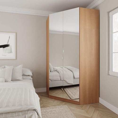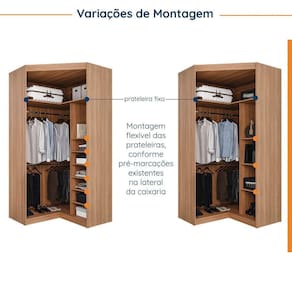 O Guarda Roupa Modular de Canto Obliquo Hera CabeCasa foi desenvolvido para trazer a experiência de ter seu móvel customizado de acordo com a necessidade do seu espaço. O móvel conta com 2 kits com 3 prateleiras e 3 cabideiros que podem ser selecionados e ajustados conforme a pré marcação na caixaria, evitando assim problemas para nivelamento dos mesmos. As portas espelhadas possuem dobradiça com amortecimento.
