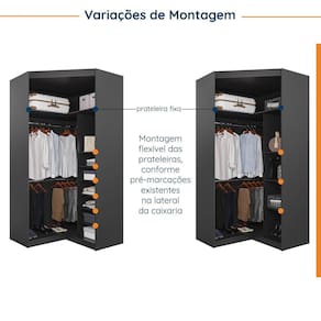 O Guarda Roupa Modular de Canto Obliquo Hera CabeCasa foi desenvolvido para trazer a experiência de ter seu móvel customizado de acordo com a necessidade do seu espaço. O móvel conta com 2 kits com 3 prateleiras e 3 cabideiros que podem ser selecionados e ajustados conforme a pré marcação na caixaria, evitando assim problemas para nivelamento dos mesmos. As portas espelhadas possuem dobradiça com amortecimento.