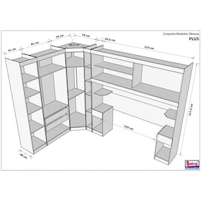 Dimensões e Características do Guarda Roupa de Canto: Altura: 217 cm | Largura: 75 cm | Profundidade: 75 cm