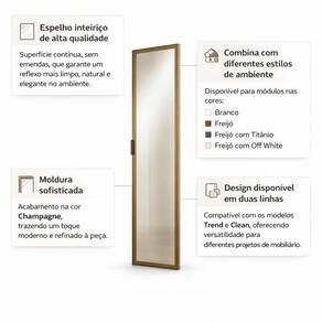 O Guarda Roupa de Canto Oblíquo 3 Portas 1 Reflecta Altezza Clean é totalmente versátil e adaptável as suas necessidades, preenchendo os espaços com excelência. Especialmente projetado para ocupar os cantos, ele possui gavetas, prateleiras, cabideiros e espaços aéreos para armazenamento. Seu grande diferencial é a porta Reflecta, uma nova possibilidade que reflete o ambiente e a luz, adicionando um toque espelhado e elegante ao espaço. O vidro é inteiriço (sem emendas), proporcionando um melhor reflexo ao usuário. O móvel pode ser utilizado de forma avulsa ou como complementar de toda a linha modulada Altezza. Acabamento da Prateleira: Pintura Texturizada UV Acabamento da Gaveta: Pintura Texturizada UV Acabamento da Porta: Pintura Texturizada UV Ambiente Principal: Quarto codigo_ean: 7900288354037 Complexidade da Montagem: Alta: deve ser montado por um montador especializado Composição: MDF Cor: Freijó/Off White Cor do Produto: Freijó/Off White Cor Interna: Marrom Escala de Brilho: Fosco Espessura da Estrutura (mm): 15 mm Espessura do Material da Estrutura: 15 mm Gaveta com Chave: Não Itens Inclusos: 1 Módulo, Kit Ferragens e Manual de Montagem Linha ou Coleção: Altezza Manual de Especificação Técnica: https://product-hub-prd.madeiramadeira.com.br/553991901/documents/52a607ac-f0c4-48d2-8bb1-850ec73e214f3444154559817734037269942.pdf Manual de Montagem e Instalação: https://product-hub-prd.madeiramadeira.com.br/553991901/documents/25430099-38a7-405c-8ab5-23c533743e1f3444153559817734037201045.pdf Marca: Belmax Material da Gaveta: MDF Material da Porta: MDF/Vidro Material da Prateleira: MDF Material Principal: MDF Necessita Montagem: Sim O Módulo Pode ser utilizado individualmente: Sim Origem do Produto: Nacional Peso: 213 kg Peso Máximo por Gaveta: 15 kg Peso Máximo por Prateleira: 10 kg Possui Espelho: Não Possui Pés: Não Produto Montado: Sim Recomendações de Uso, Manutenção e Limpeza: Utilizar pano seco. Sistema de Montagem: Parafusos, cavilhas, minifix e pregos Tipo de Corrediça da Gaveta: Metálica Telescópica Tipo de Dobradiça/Corrediça da Porta: Alumínio Tipo de Guarda-Roupa: Solteiro Tipo de Módulo: Guarda-Roupa Tipo de Puxador da Gaveta: Externo Tipo de Puxador da Porta: Externo