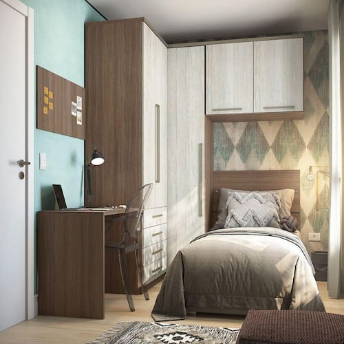 A Linha Modulada Connect foi desenvolvida se adequando a vários espaços, de grandes a pequenos. Seus Roupeiros e Módulos com 236 cm de altura oferecem divisórias para atender diversas necessidades. Seus módulos com portas tem profundidade de 54cm possibilitando acomodar roupas sem amassar. Produzido em MDP de 15mm, dobradiças reforçadas em 35mm e corrediças telescópicas em todas as gavetas que possibilitam abertura total. Para esta proposta usamos as medidas de parede: Lado Cabeceira 190cm X 213cm.